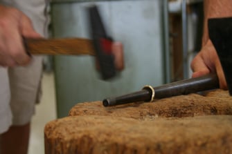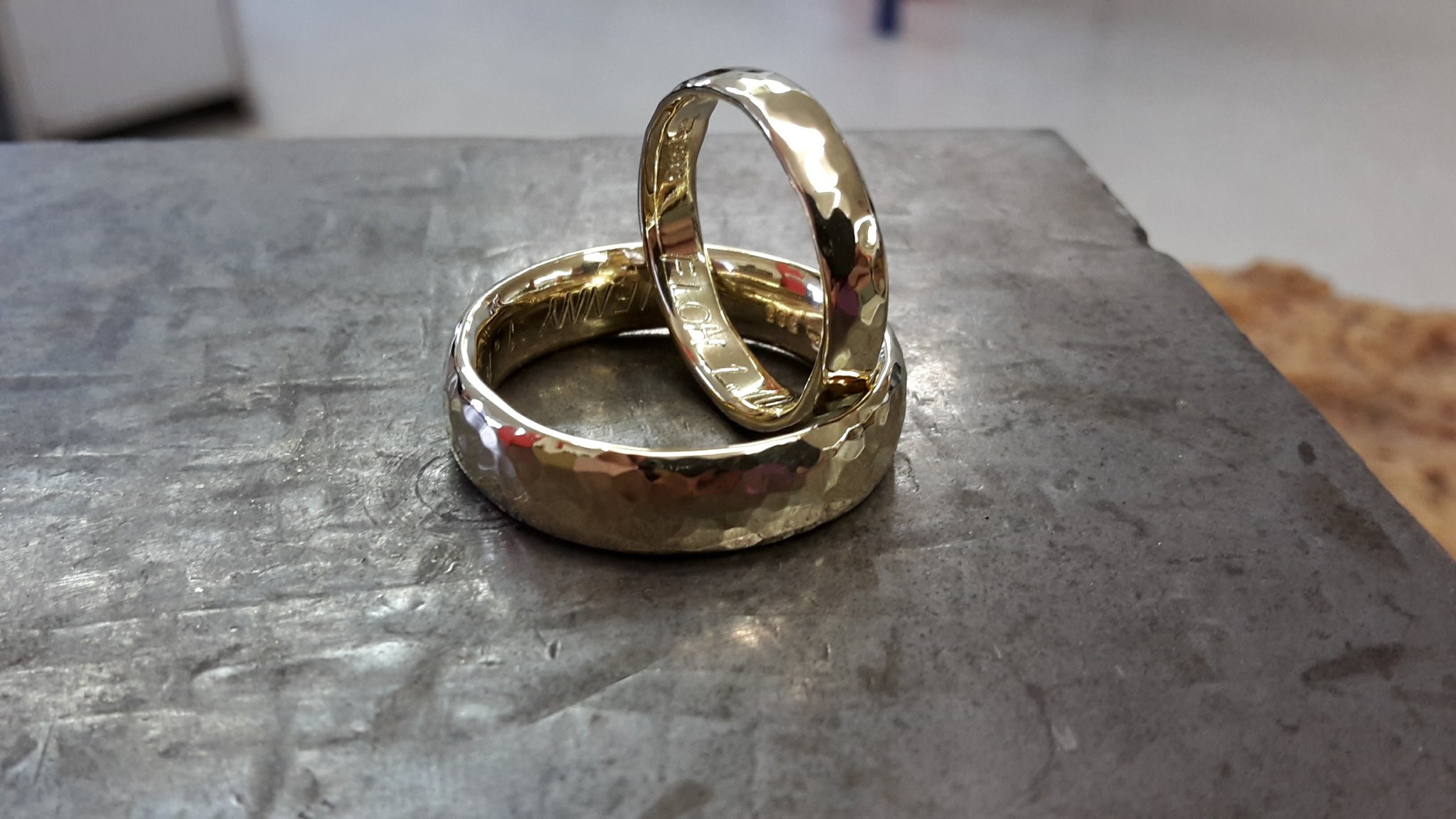 Sie schmieden Ihre Ringe mit bester Goldschmiede-tradition. Aus einem besonders harten und langlebigen gewalzten Gold. Nach der Herstellung des Ringrohlings wird dieser von Ihnen auf einem Stahldorn ge-schmiedet. Zur Perfektionierung wird Ihren Ringen die von Ihnen gewünschte Optik verliehen. Diese traditionelle Goldschmiedemethode verleiht Ihren Ringen Langlebigkeit, besondere Härte und Festigkeit gegebenüber der einfach gestalteten Gussmethode.